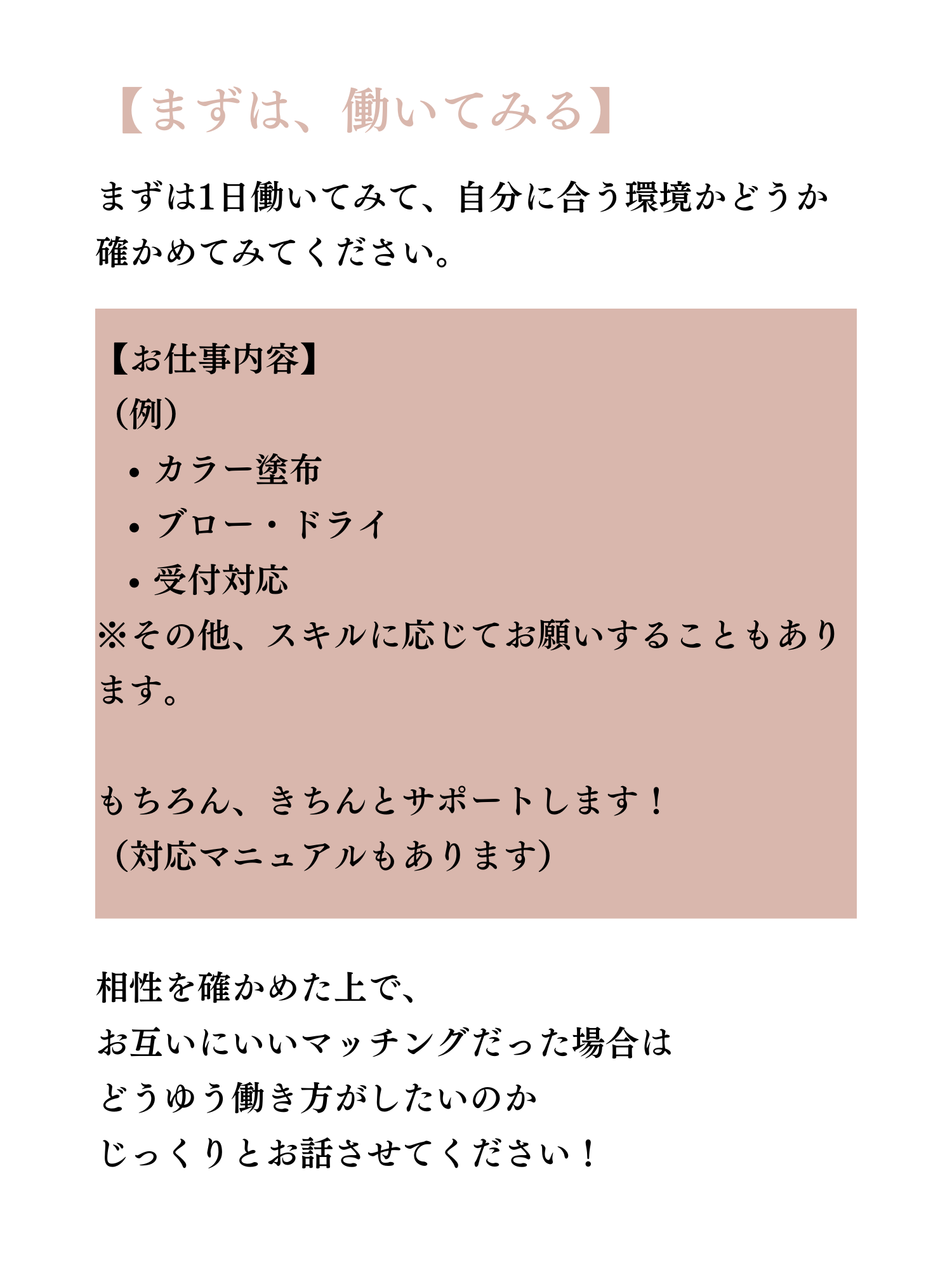 選べる勤務時間帯 ①9:30〜15:30(6時間勤務) ②10:00〜16:00 (6時間勤務) ③10:30〜16:30(6時間勤務) *その他勤務時間帯ご相談に応じます |